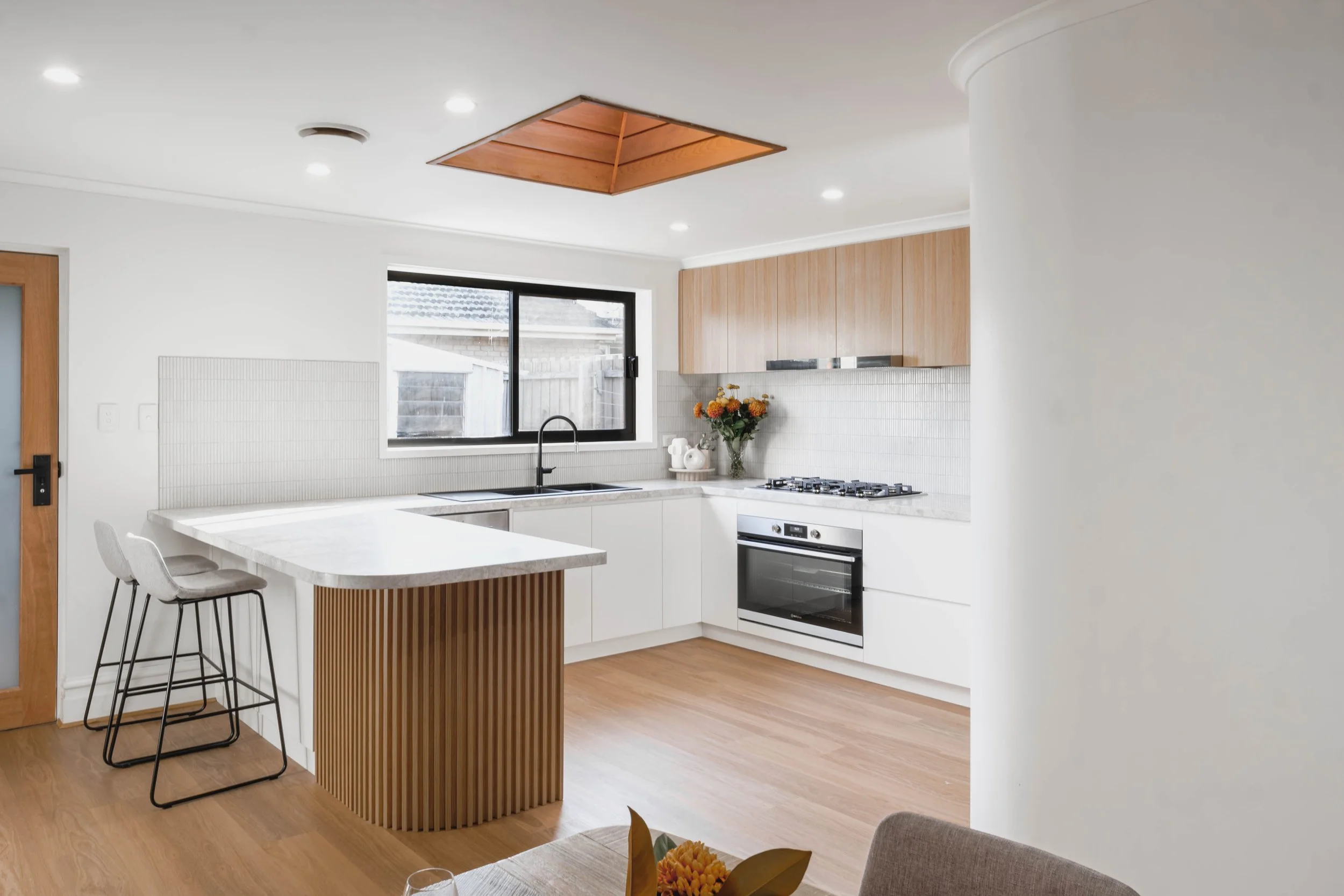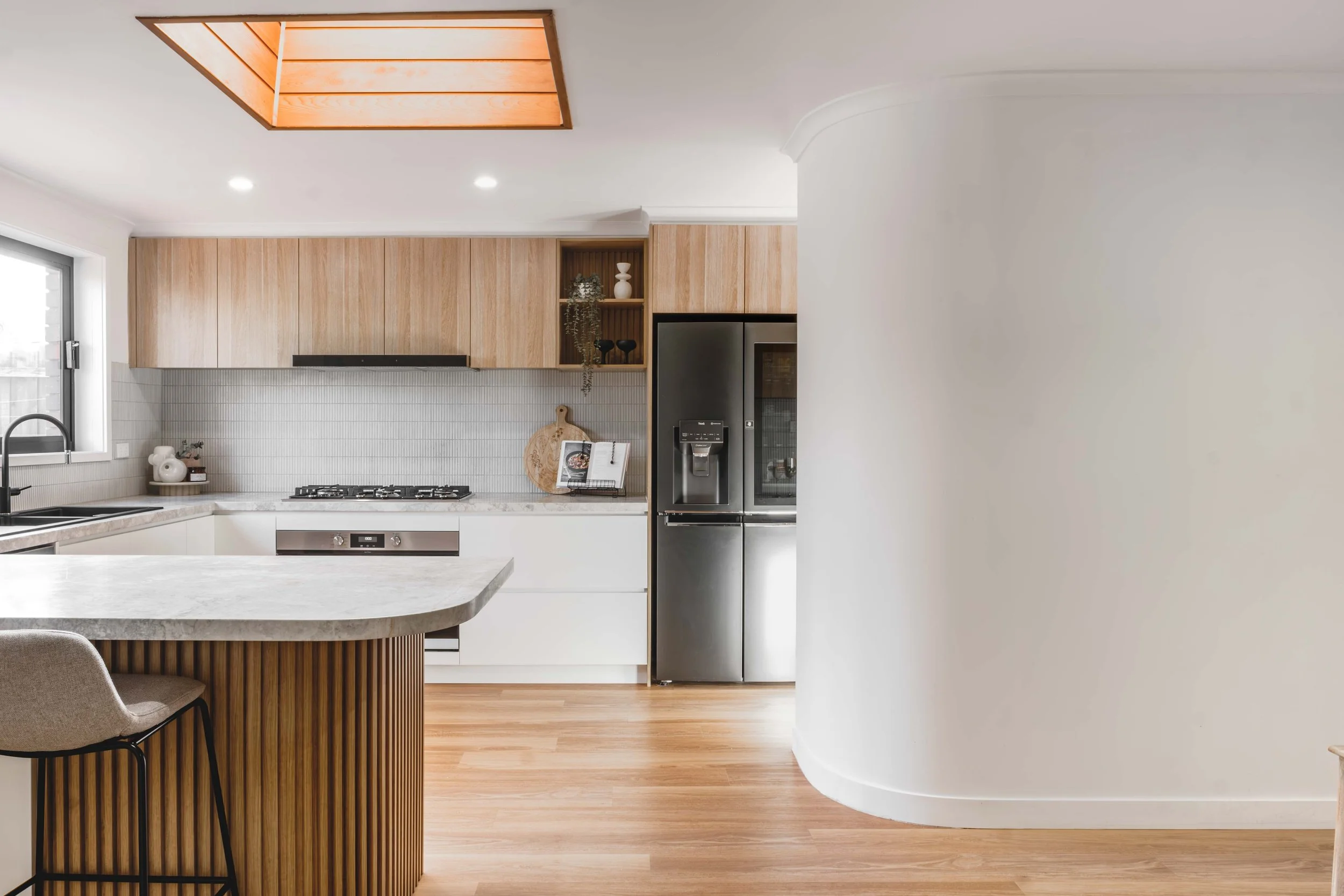 Widing the island bench and moving it further away from the kitchen wall of utilities allows for better circulation and functionality. The warm tones of the timber, combined with the marble benchtops and subtle curves subtly nod back to the original house.